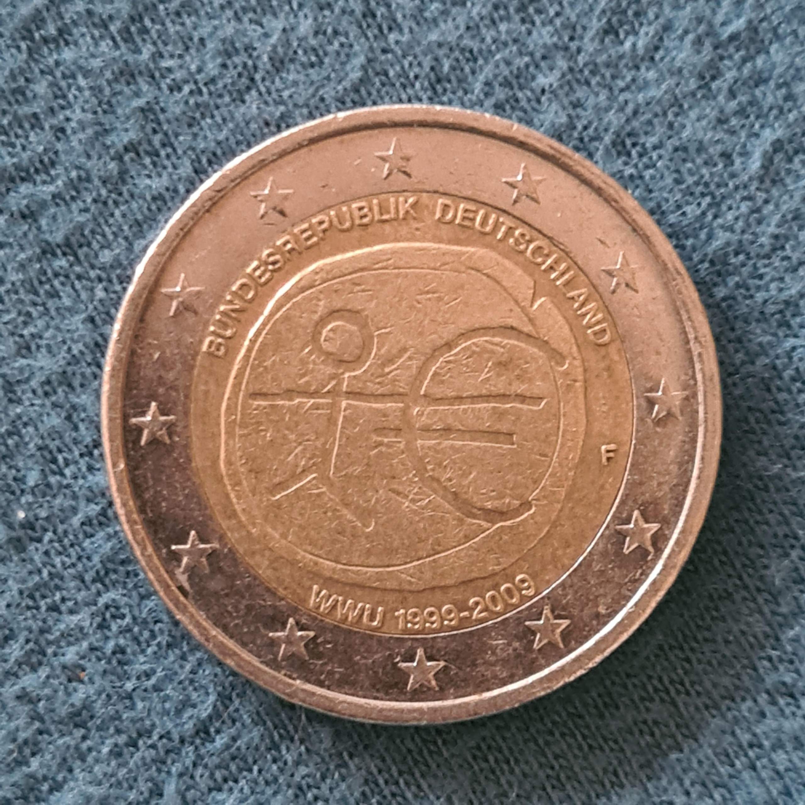 German 2 Euro Coin 2009 - Economic and Monetary Union WWU German Commemorative 2 Euro Coins 2009 - Economic and Monetary Union WWU. At the bottom "half moon" there are the initials WWU 1999-2009, on the right the mint symbol (A/D/F/G/J) and at the top BUNDESREPUBLIK DEUTSCHLAND (Federal Republic of Germany). All around are engraved.