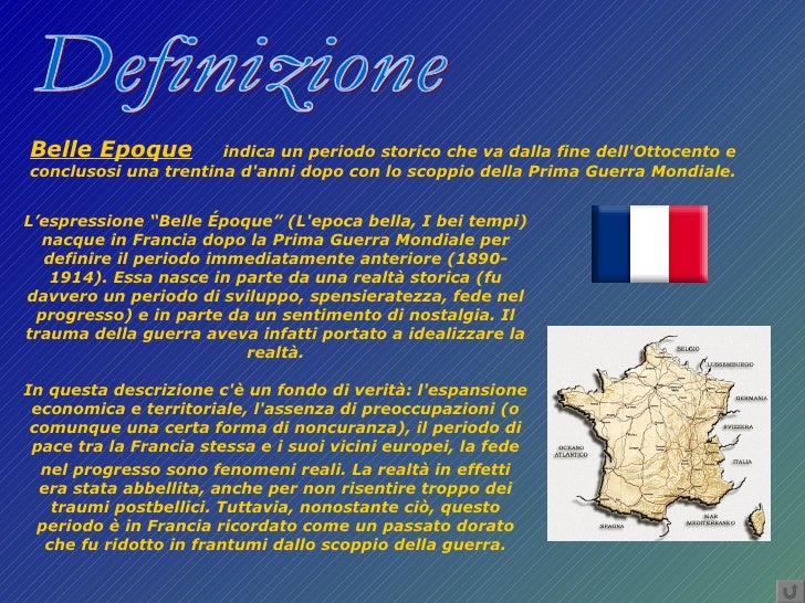 Tesina Belle Époque- storia INTRODUZIONE. La Belle époque (1871 - 1914), cioè "i bei tempi", indica il periodo storico, socio-culturale e artistico europeo che va dall'ultimo ventennio dell'800 fino allo scoppio della prima guerra mondiale.