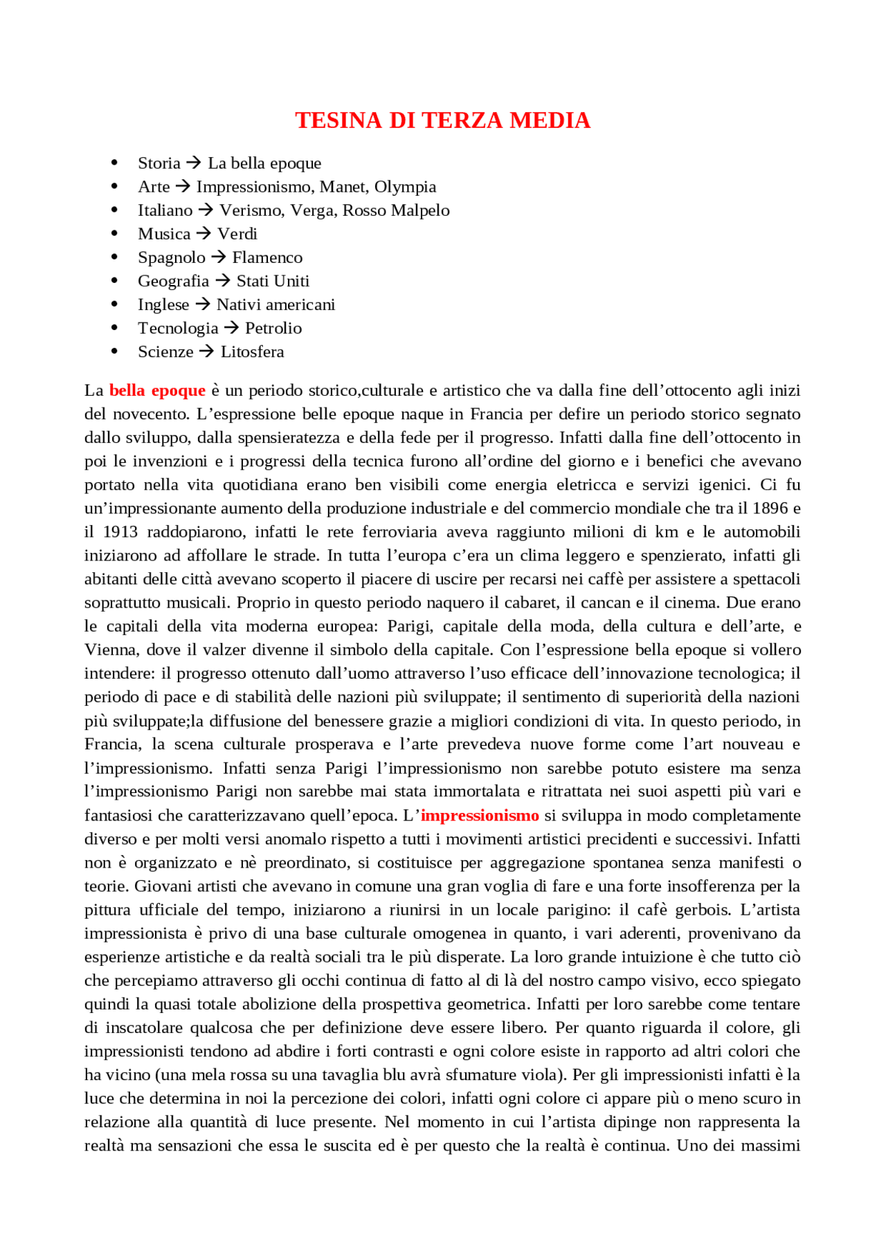 Scarica TESINA TERZA MEDIA - LA BELLA EPOQUE e più Tesine di Maturità in PDF di Italiano solo su Docsity! TESINA DI TERZA MEDIA Storia La bella epoque Arte Impressionismo, Manet, Olympia Italiano Verismo, Verga, Rosso Malpelo Musica Verdi Spagnolo Flamenco Geografia Stati Uniti Inglese Nativi americani Tecnologia Petrolio Scienze Litosfera La bella epoque è un periodo storico,culturale e.