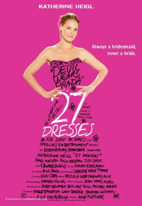 27 Dresses. Directed by Anne Fletcher. Comedy, Romance. PG-13. 1h 51m. By A.O. Scott. Jan. 18, 2008. At the beginning of "27 Dresses," Jane (Katherine Heigl), a serial bridesmaid with an.