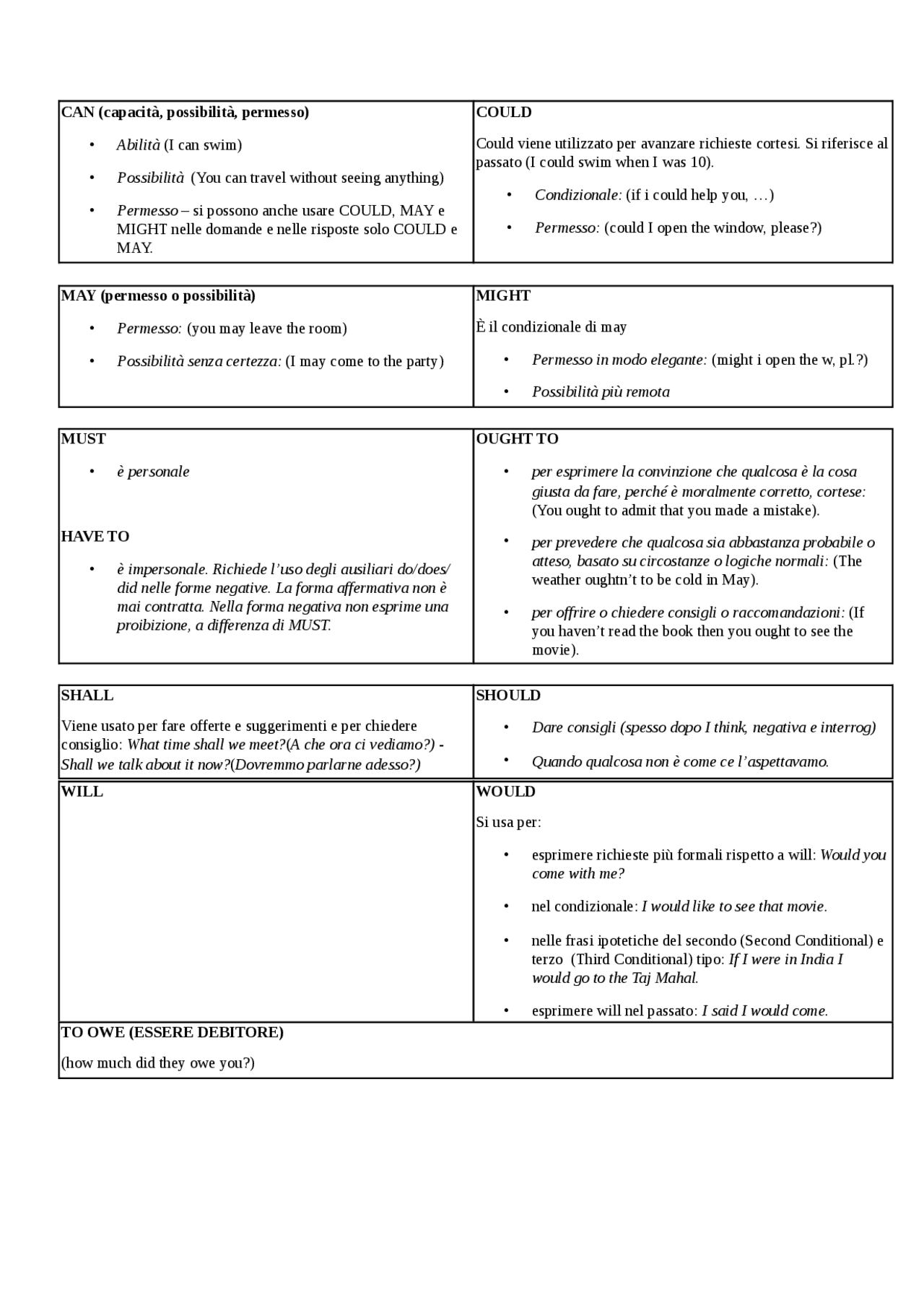 Tabella dei verbi modali inglesi Docsity