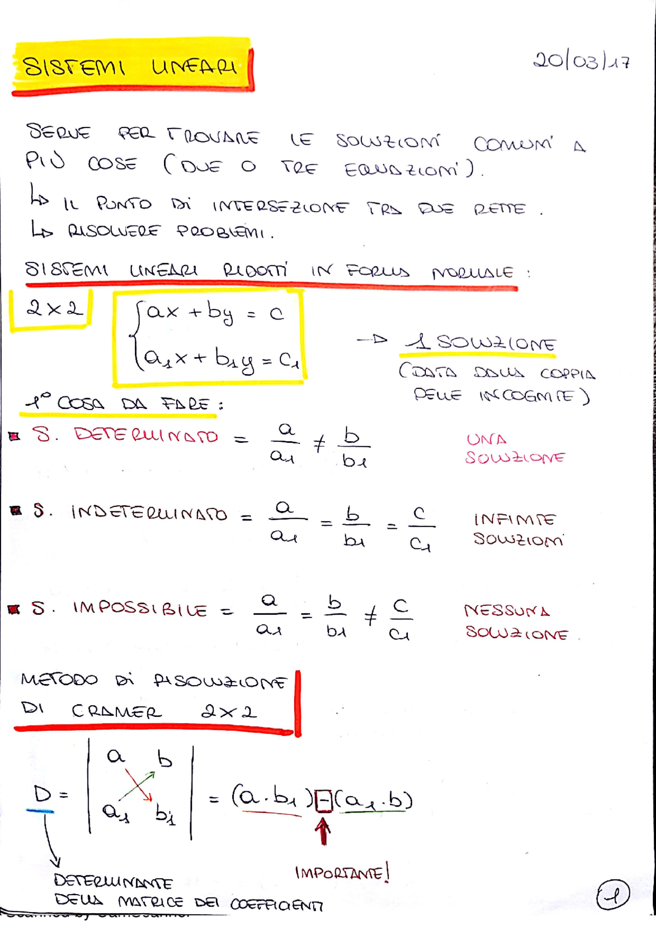 Per risolvere un sistema lineare esiste anche il metodo di Cramer: questo metodo ha sicuramente un procedimento meno intuitivo, ma è necessario conoscerlo poichè - oltre ad avere enorme importanza teorica - può tornare utile per risolvere più rapidamente alcune tipologie di esercizi, come per esempio i sistemi lineari con parametri.