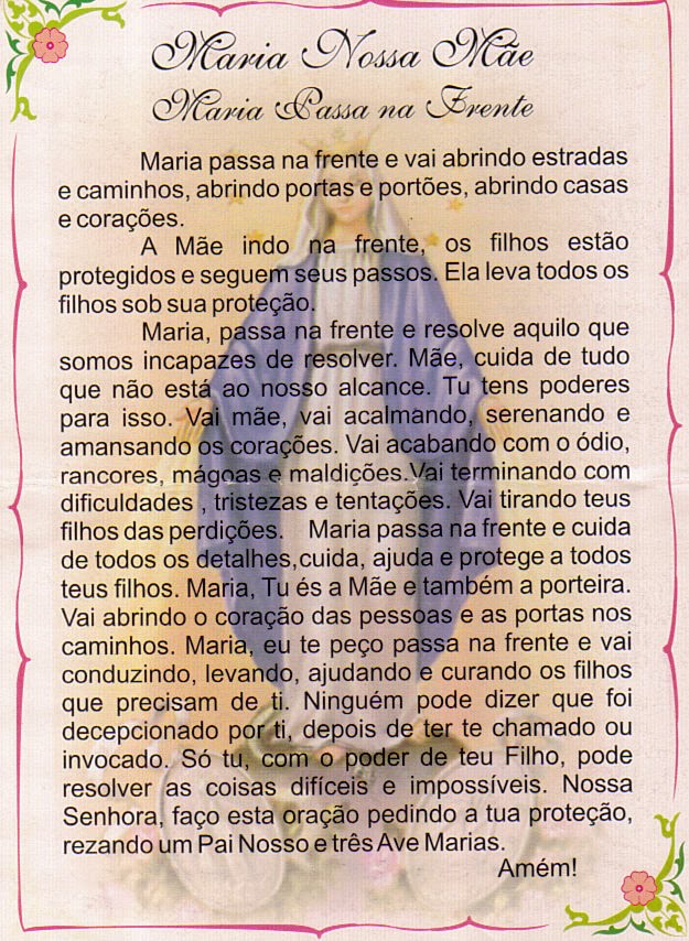 Oração Maria passa na frente. Maria, passa na frente e vai abrindo estradas e caminhos. Abrindo portas e portões. Abrindo casas e corações! A Mãe vai à frente, e os filhos protegidos seguem seus passos. Maria, passa à frente e resolve tudo aquilo que somos incapazes de resolver. Mãe, cuida de tudo o que não está ao nosso alcance.