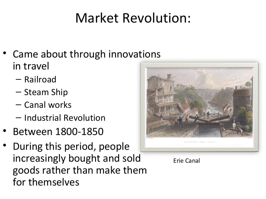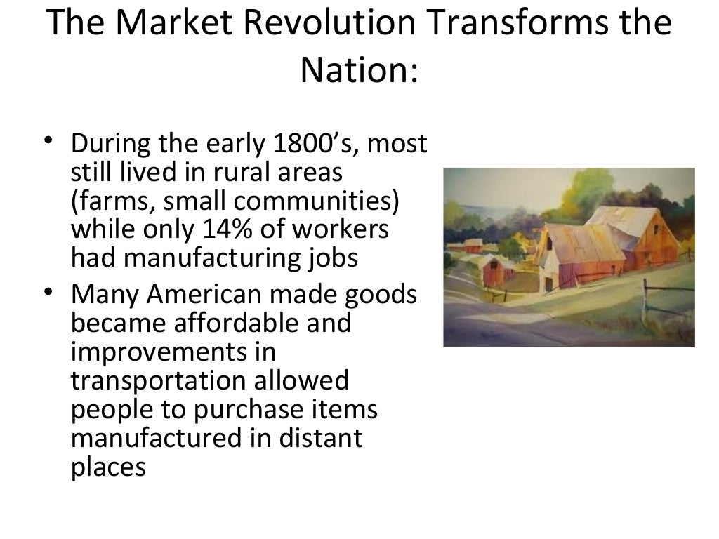 AboutTranscript. The Market Revolution transformed American society in the 19th century. It introduced factory labor, shifted the economy from barter to wages, and connected the U.S. to global markets. This period also saw the Second Great Awakening, a religious revival possibly triggered by these societal changes.