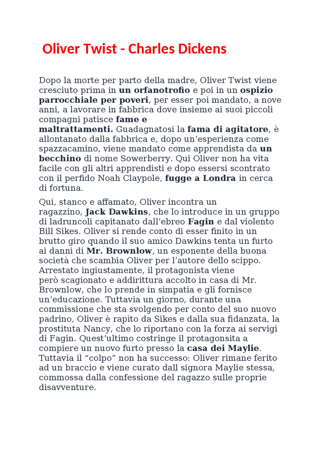 Riassuntotrama di Oliver Twist Charles Dickens Docsity