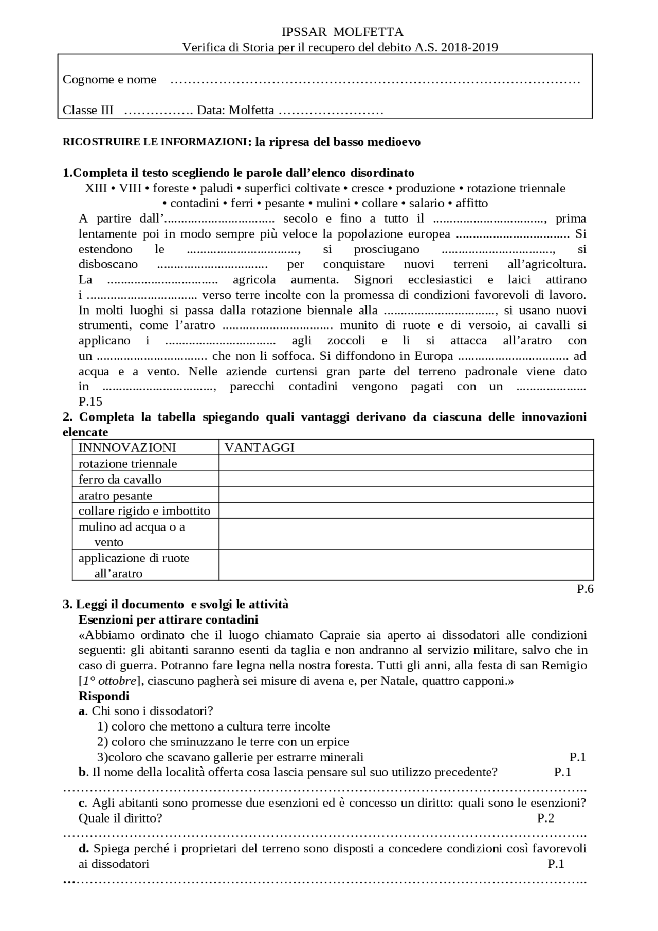 VERIFICA SUL MEDIOEVO Esercizi di Storia Docsity