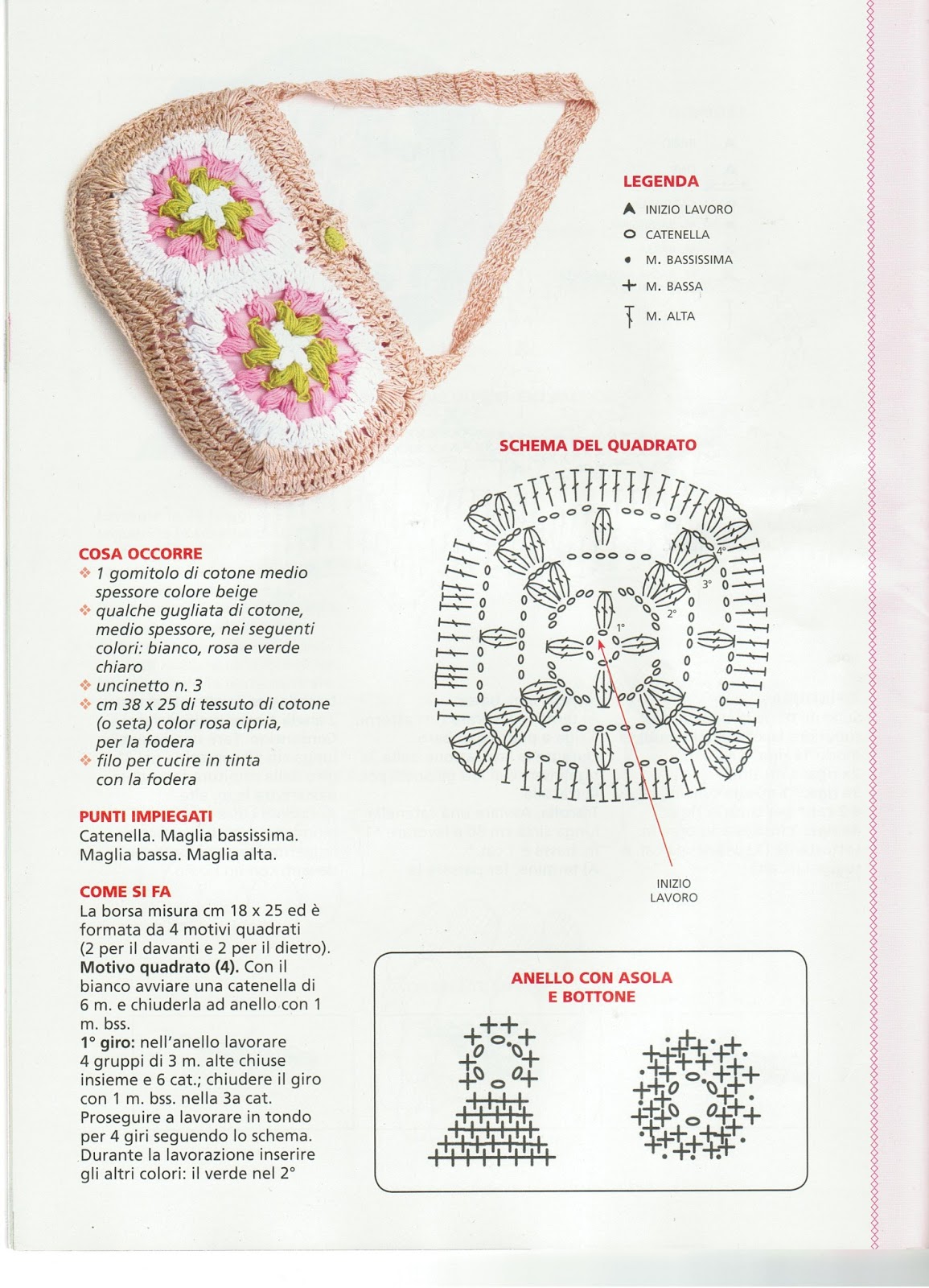 Avviare 30 catenelle e, a partire dalla seconda, lavorare 29 m. basse. Agli angoli lavorare 3 maglie basse nella stessa catenella (vedi schema). Proseguire seguendo lo schema degli aumenti e lavorare poi senza aumenti. Per il punto utilizzato per la mia borsa, e per la lavorazione dei manici, guardate il video: